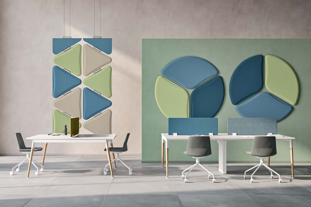 Elementi d’arredo con funzione acustica, studiati per ambienti operativi, sale riunioni e spazi open-space.